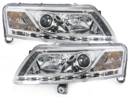 Φανάρια εμπρός για Audi A6 (2004-2007) με led φώτα ημέρας – chrome , χωρίς λάμπες (Η7) – σετ 2τμχ.