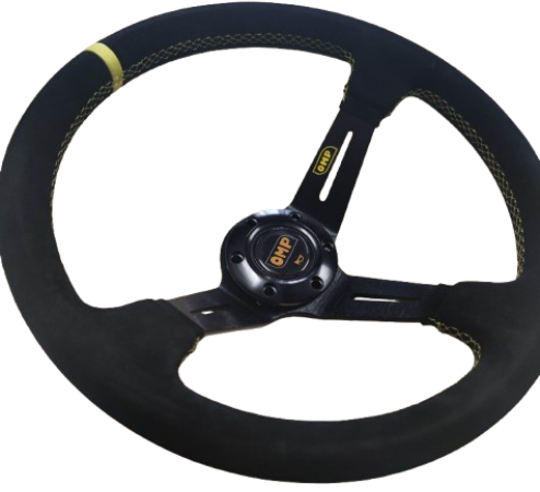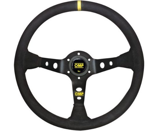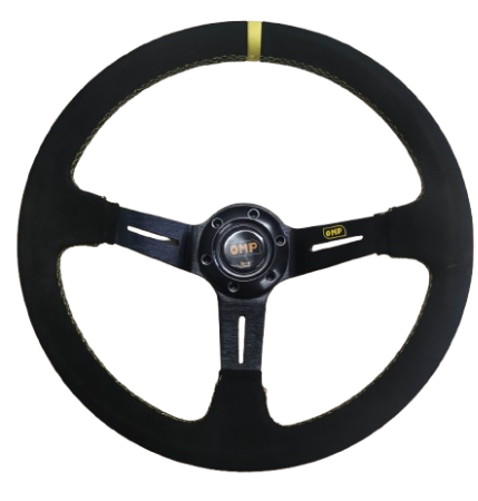 OMP – αγωνιστικό τιμόνι βαθύκωνο μαύρο alcantara με κίτρινες ραφές